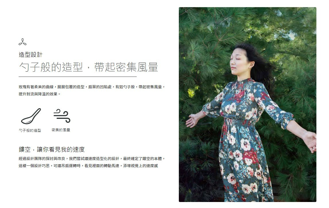 為了充分發揮吊扇效能,新的DC馬達技術,讓吊扇得以有低耗能、高風量的效果。玫瑰扇利用造型的層疊包覆,如同玫瑰花瓣般。