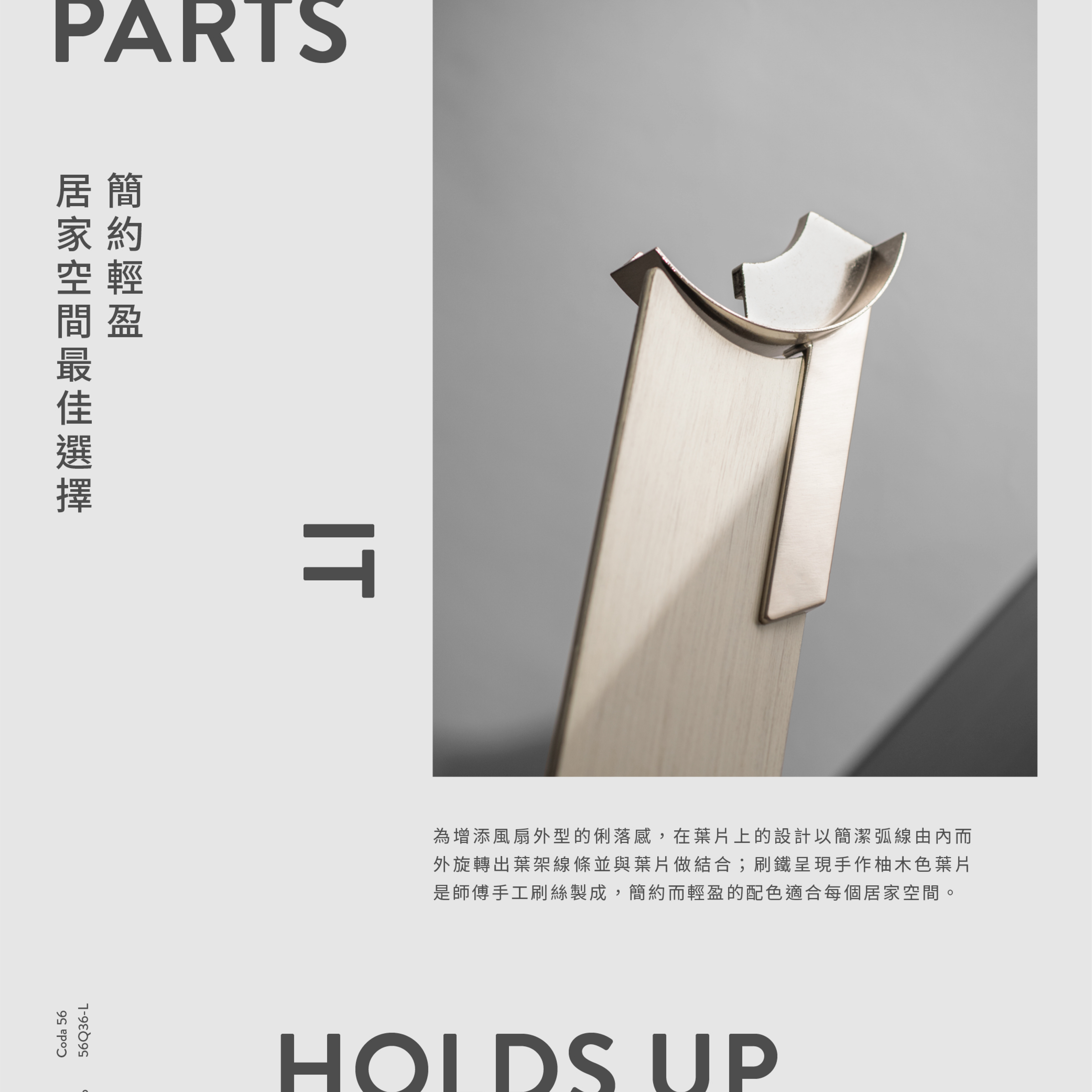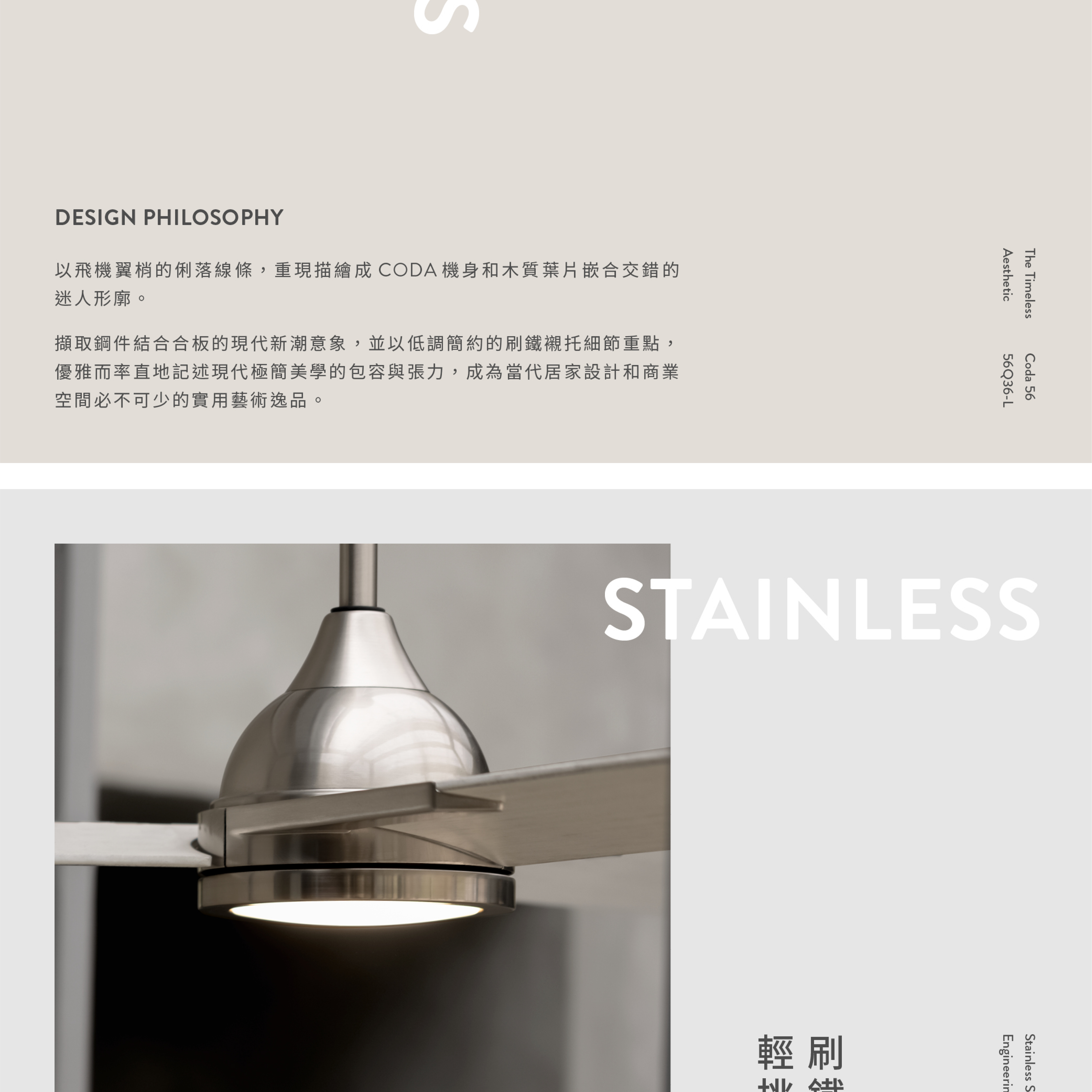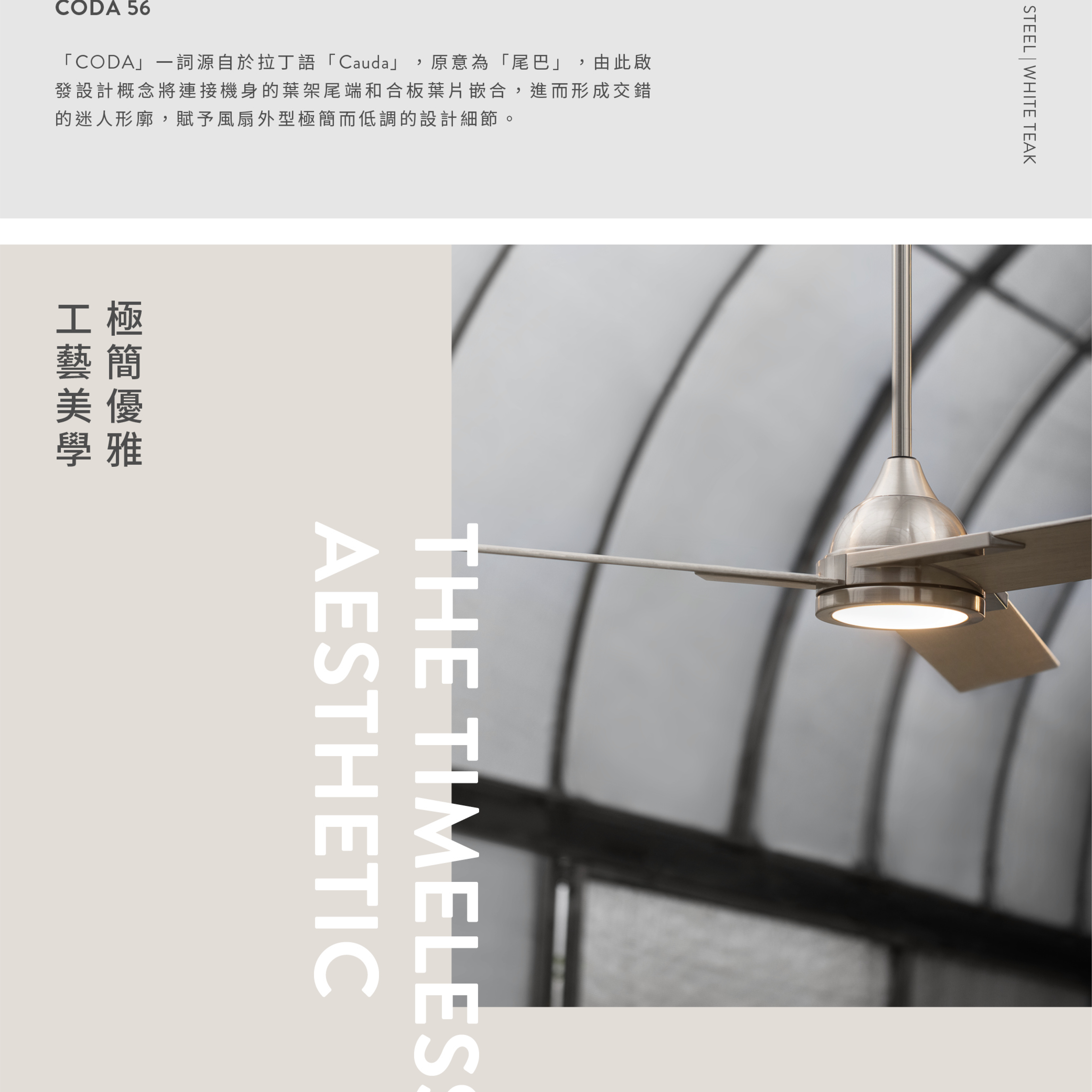 「CODA」一詞源自於拉丁語「Cauda」,原意為「尾巴」,由此啟發設計概念將連接機身的葉架尾端和合板葉片嵌合,進而形成交錯的迷人形廓,賦予風扇外型極簡而低調的設計細節